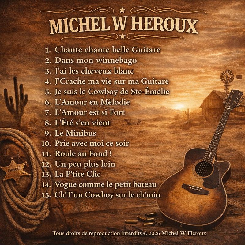 Avec plus de 20 ans de passion pour la musique country, Michel W Héroux présente une collection unique de 15 chansons originales, chacune reflétant une histoire, une émotion et un style qui lui sont propres. Chaque morceau te transporte dans l’univers country francophone avec une authenticité rare, entre hommage à la tradition et personnalité profondément ancrée.